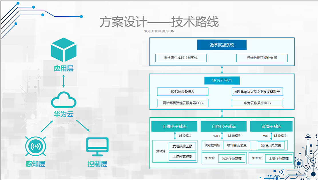作品简介:本作品面向偏远的光伏/风电生产地区运维人员生活区场景,针对改善运维人员长期居住条件艰苦这一痛点,通过综合运用物联网技术、数字孪生技术、云计算及人工智能算法,构建了一套智能化、易部署、低运维成本的综合水/电资源利用的滴灌系统,旨在提升我国西北部大规模风/光发电场所运维人员生活区的生活质量。