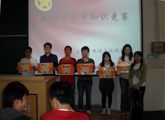 竞赛内容涉及中国共青团团章、五四运动的历史、五四精神的内涵等。竞赛采取晋级赛的形式,题型包括判断题、选择题、问答题。最终08电气1班获得了一等奖,07电子1班、07电子2班及08电气4班分别获得了二等奖;08电气6班、08电子2班、08电子3班分别获得了三等奖。