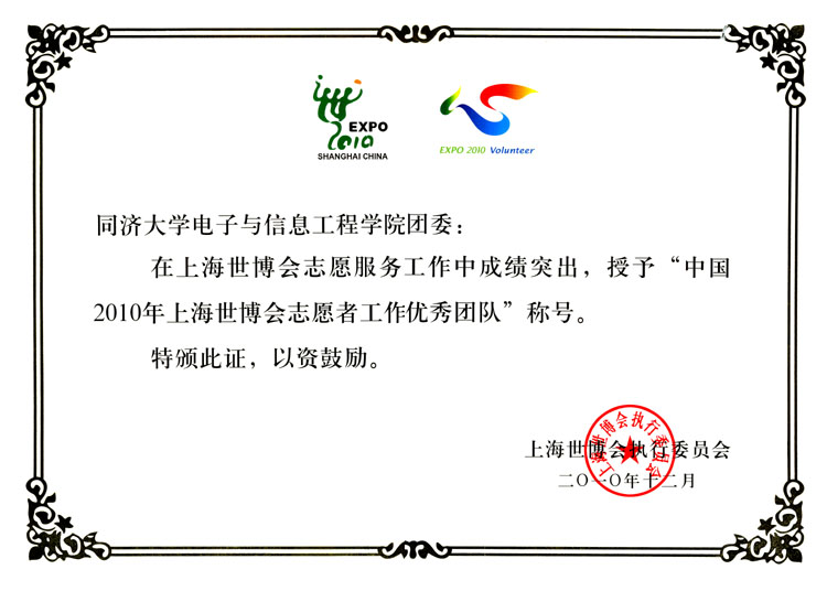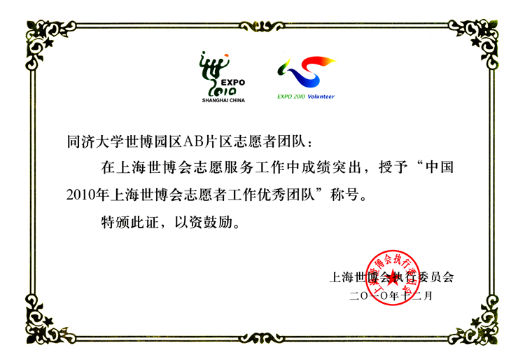 获得市级表彰的是:学院团委、必赢bwin官网志愿者所在AB片区志愿者团队两个单位均获“上海世博会工作优秀团队”称号,(全校共有6个团队获此荣誉);程 莉获上海市“创先争优,世博先锋行动”“五带头”共产党员称号;唐志宇获上海市教卫“世博先锋行动”优秀共产党员称号;刘永焕、程 莉、唐志宇、曹 阳、印海文、于 淼、冯怡然、何 伟、黄黎华、居征宇、李铭洋、李维丹、林显琦、田正之、闫明皓等15人分获“上海市优秀志愿者”荣誉。
