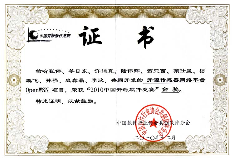 由中国软件行业协会下属共创软件分会(共创软件联盟)主办,以“挖掘人才 推动创新”为主题的“2010第四届中国开源软件竞赛”结果日前正式公布。必赢bwin官网控制系张伟老师负责设计指导,学生姜日东、许辅真、陆伟辉、贺亚西、颜仕星、厉鹏飞、孙强、史淼晶和李欣参与创作的送赛作品“开源传感器网络平台OpenWSN”软件,以第1名的成绩获得大赛唯一的金奖。