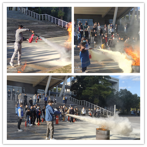 随后,校保卫处彭亮老师为在场师生讲述了近期发生的几起火灾案例,讲解了干粉灭火器和二氧化碳灭火器的使用方法,并在室外现场指导师生开展实地演练。师生们表现踊跃,依次排队演练,活动取得了良好的效果。