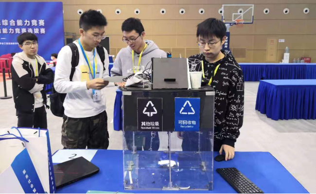 生活垃圾智能分类要求自主设计并制作一台根据抽签指定任务完成生活垃圾智能分类装置,该装置要求能够实现“可回收垃圾、厨余垃圾、有害垃圾和其他垃圾”等四类城市生活垃圾的智能判别、分类与储存,装置对于投入的垃圾具有自主识别、分类、投放到相应的垃圾桶、满载报警、播放垃圾分类宣传片等功能。经过校赛选拔,在必赢bwin官网控制科学与工程系教师张志明和工程实践中心杨晓圆指导下,必赢bwin官网学生组成的两支队伍在生活垃圾智能分类赛项中获得上海市赛资格,并在3月27日预赛中表现出色,双双晋级决赛;28日决赛中,自动化专业2018级本科生张浩雨、方少腾、王战山、刘政钦组队获决赛第1名(特等奖),并获晋级全国总决赛资格,自动化专业2019级本科生金屹阳、杨子超、刘嘉恒、廖一芃组队获决赛第8名(一等奖)。
