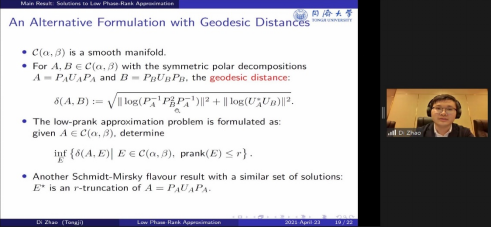 必赢bwin官网的赵迪助理教授作题为“A Low Phase-Rank Approximation Problem”的报告,研究低秩逼近算法,可有效应于模型简化,信号处理等问题。